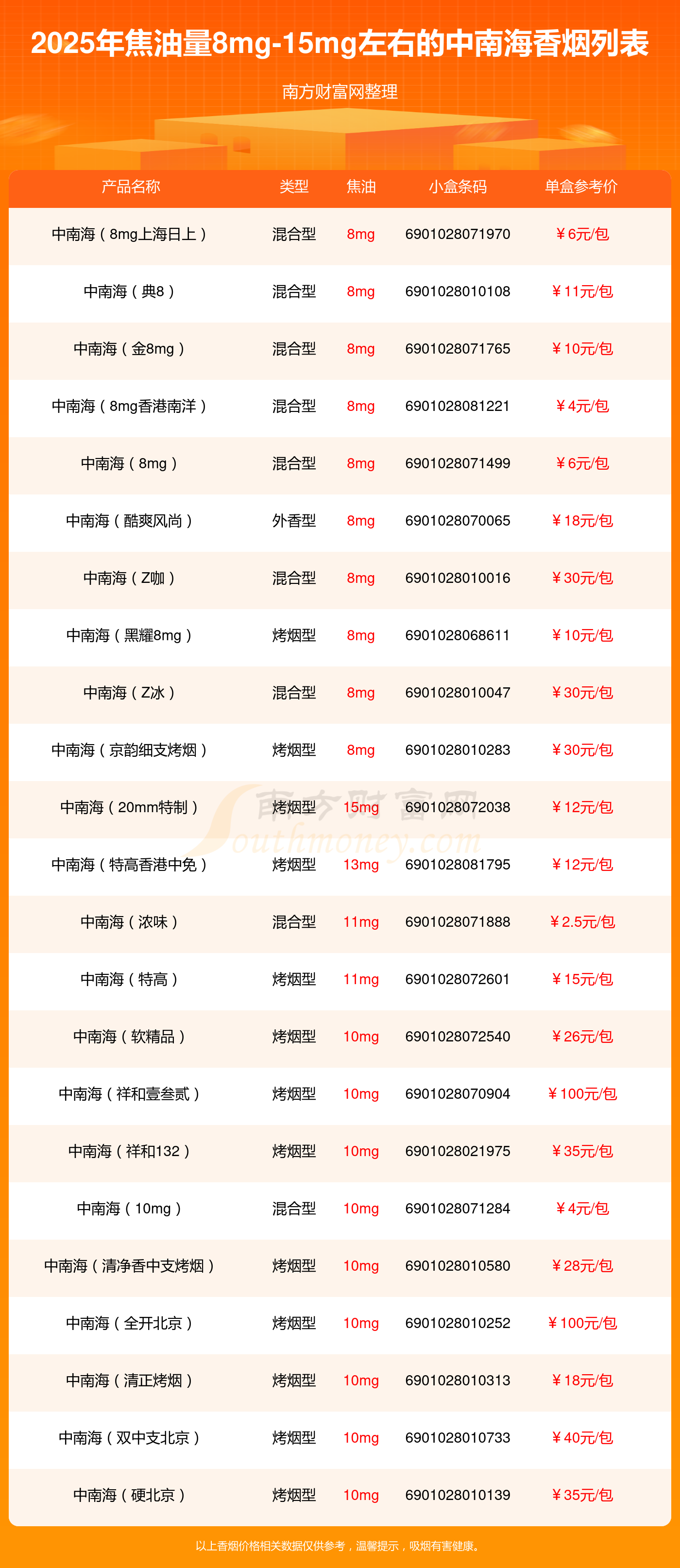 中南海香烟焦油量8mg-15mg左右的烟有中南海(8mg上海日上)、中南海(典8)、中南海(金8mg)、中南海(8mg香港南洋)、中南海(8mg)、中南海(酷爽风尚)、中南海(Z咖)、中南海(黑耀8mg)、中南海(Z冰)、中南海(京韵细支烤烟)等,具体价格如下: