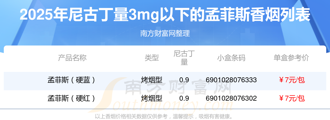 择烟网为大家盘点了孟菲斯香烟尼古丁量3mg以下的,分别有孟菲斯(硬蓝)、孟菲斯(硬红)等,具体价格如下: