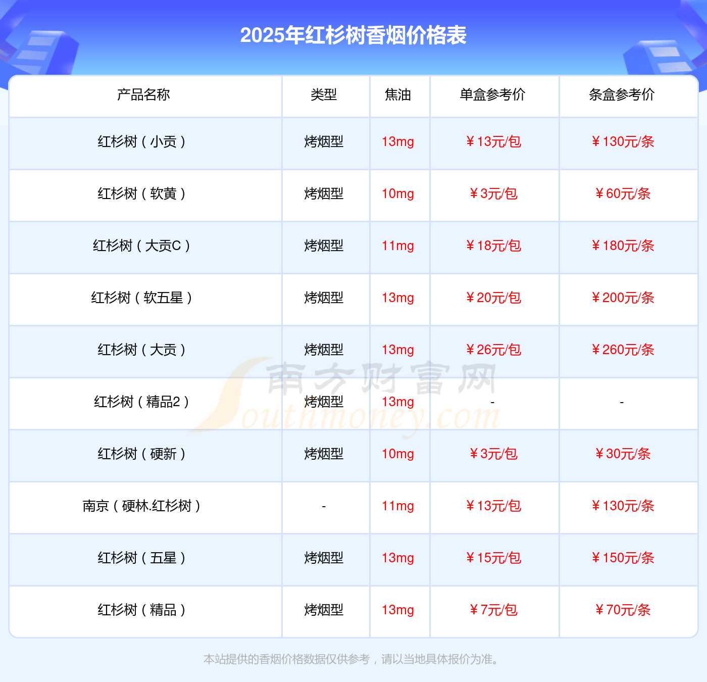 红杉树是江苏四大名烟之一,红杉树以“红红火火红杉树,红红火火红中国”、“红红火火红杉树,红红火火好生活”为品牌形象,包装具有传统特色。红杉树连续多年被评为行业名优卷烟,并进入全国烟草百牌号目录,其中红杉树软五星是较为人熟知和喜爱的单品,凭借红杉树一贯红火的设计和出色的品质,是20元左右性价比不错的卷烟之一。