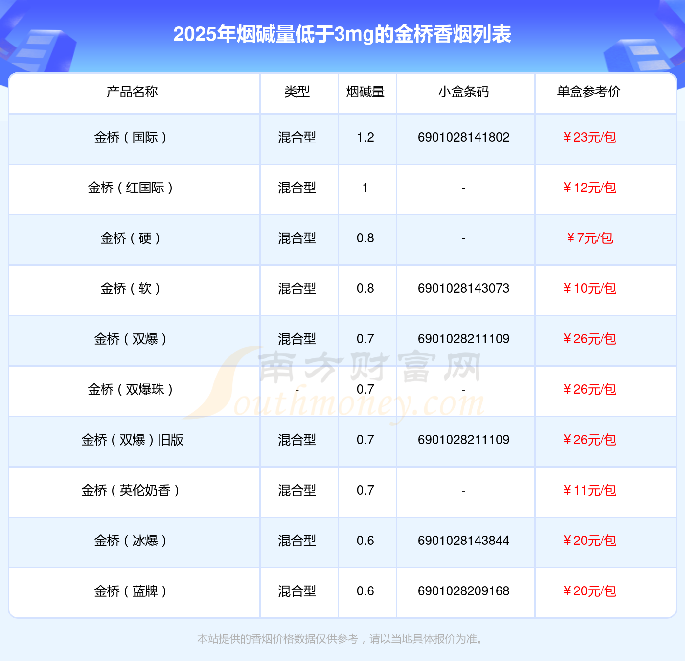 烟碱量低于3mg的金桥香烟有哪些?择烟网为大家整理盘点,有金桥(国际)、金桥(红国际)、金桥(硬)、金桥(软)、金桥(双爆)、金桥(双爆珠)、金桥(双爆)旧版、金桥(英伦奶香)、金桥(冰爆)、金桥(蓝牌)等,详细价格如下: