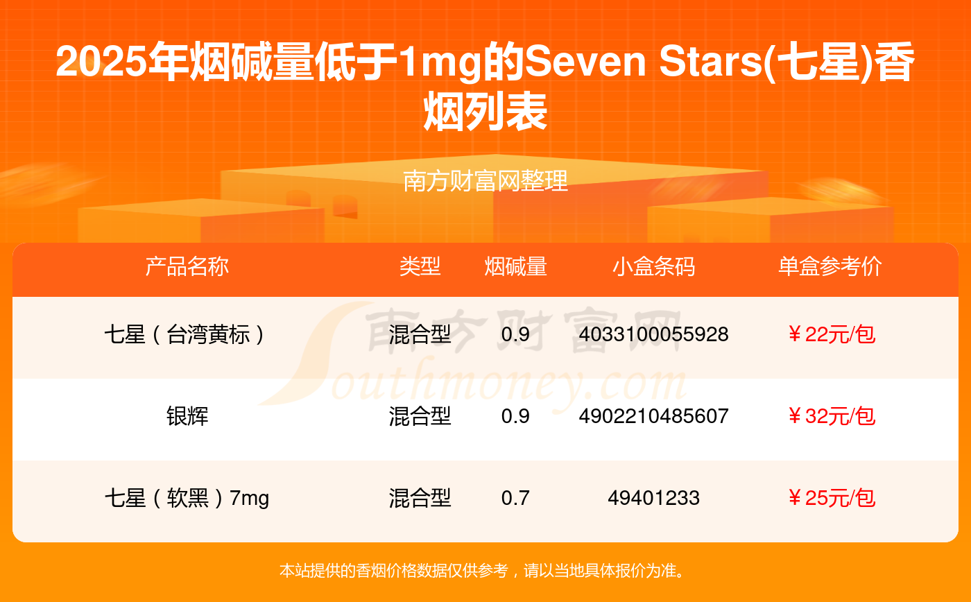 择烟网为大家盘点了烟碱量低于1mg的Seven Stars(七星)香烟,有七星(台湾黄标)、银辉、七星(软黑)7mg等,详细价格如下: