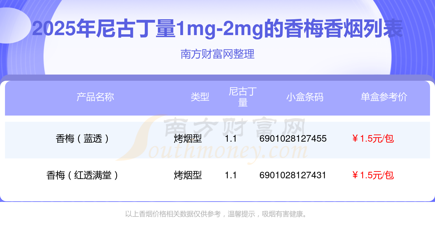 择烟网为大家盘点了香梅香烟尼古丁量1mg-2mg的烟,有以下这些: