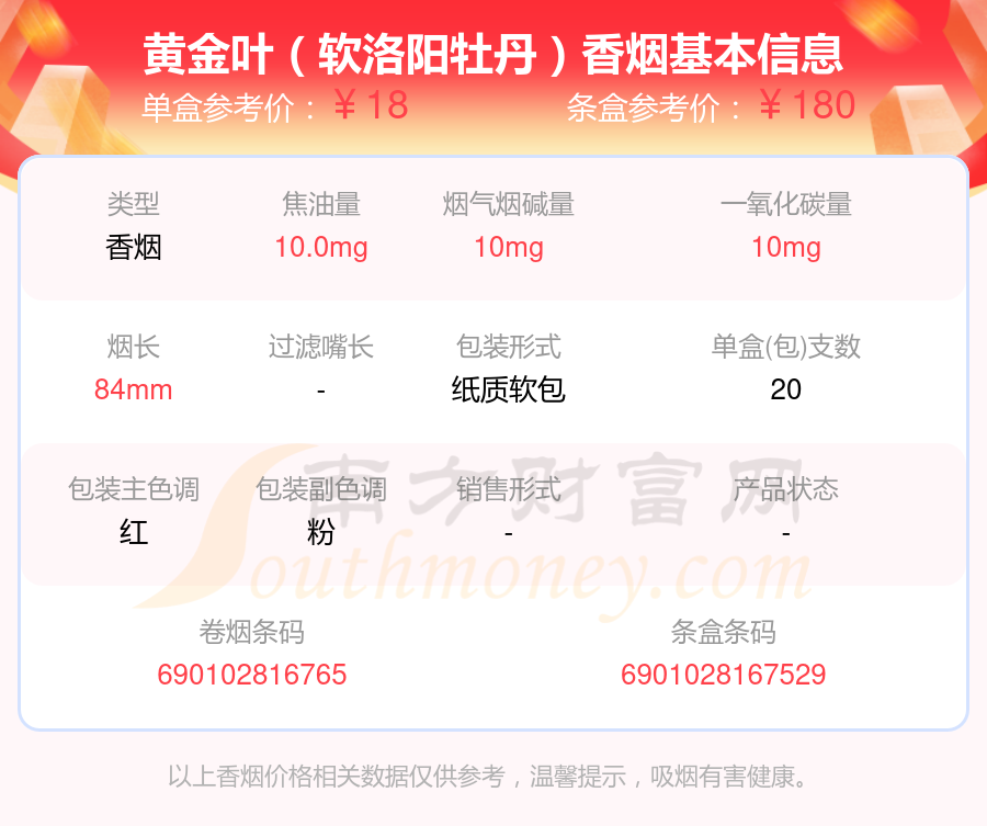 黄金叶香烟烟碱5mg以上的烟有黄金叶(软洛阳牡丹)、黄金叶(百年浓香)典藏等,具体价格如下: