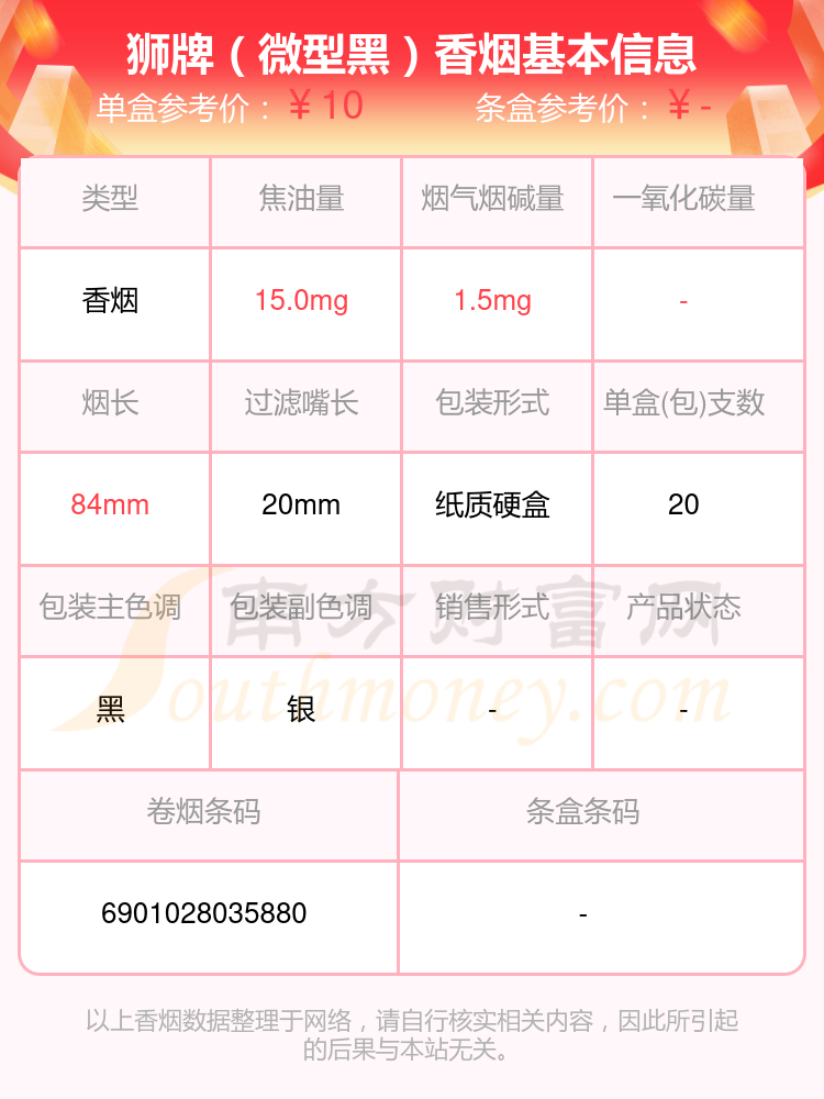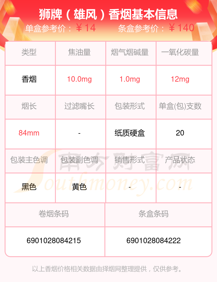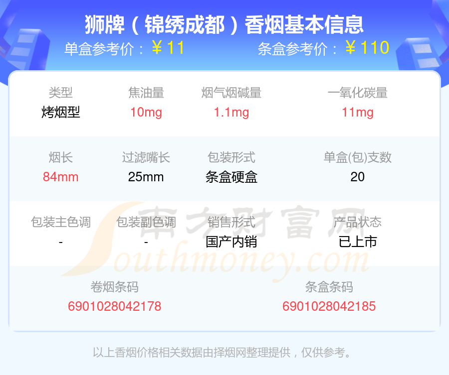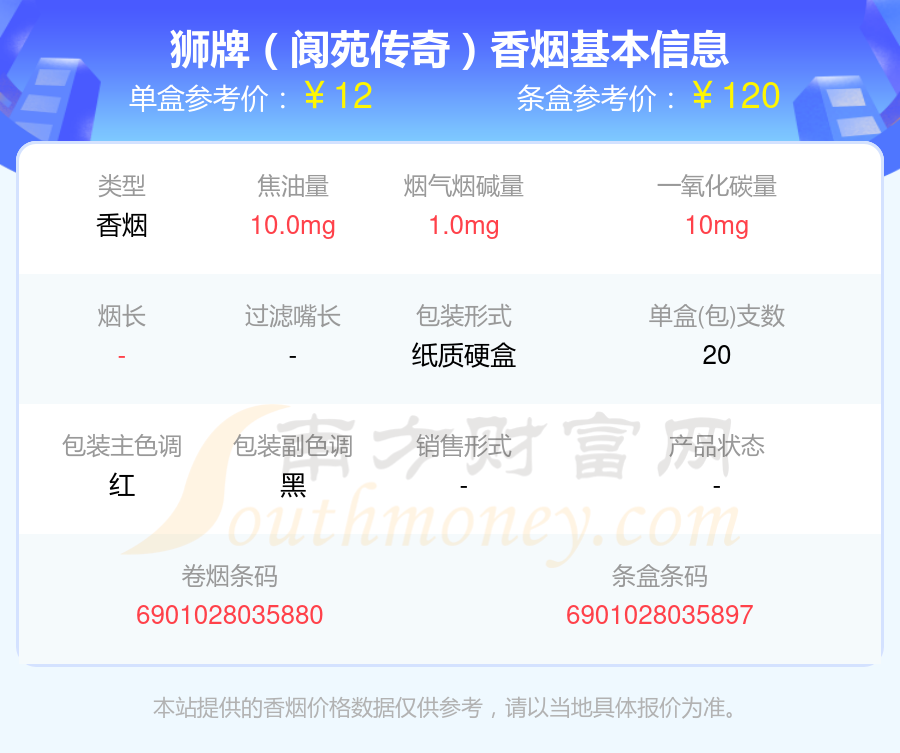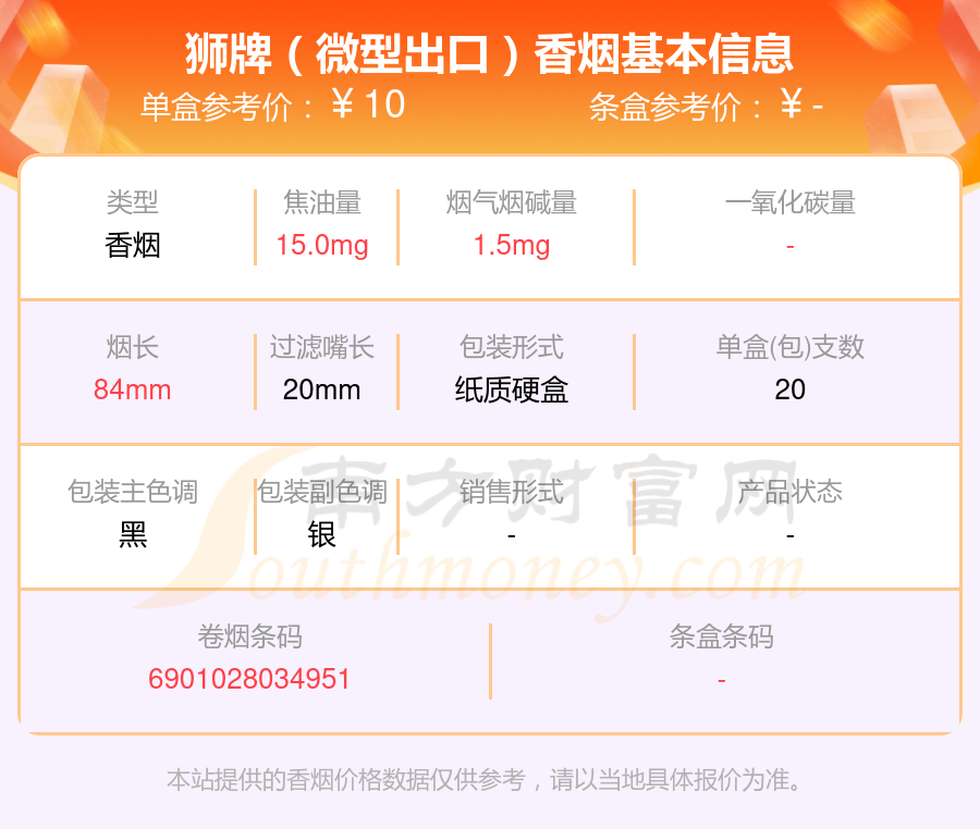 狮牌(微型出口)参考价10.0元/包、狮牌(微型黑)参考价10.0元/包、狮牌(银)参考价10.0元/包、狮牌(锦绣成都)参考价11元/包、狮牌(原香)参考价11.0元/包、狮牌(雄风)参考价14.0元/包、狮牌(阆苑传奇)参考价12.0元/包、狮牌(特香)参考价5.5元/包、狮牌(微型)参考价10.0元/包、狮牌(加勒比阳光)参考价100元/包等。