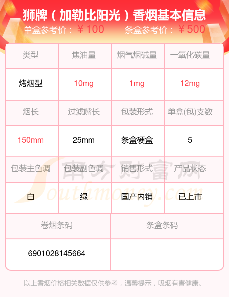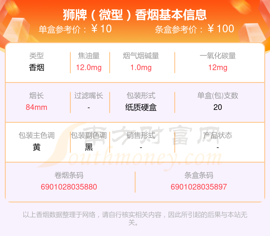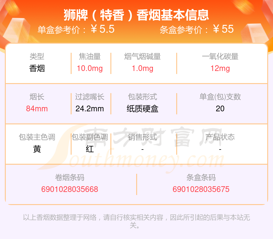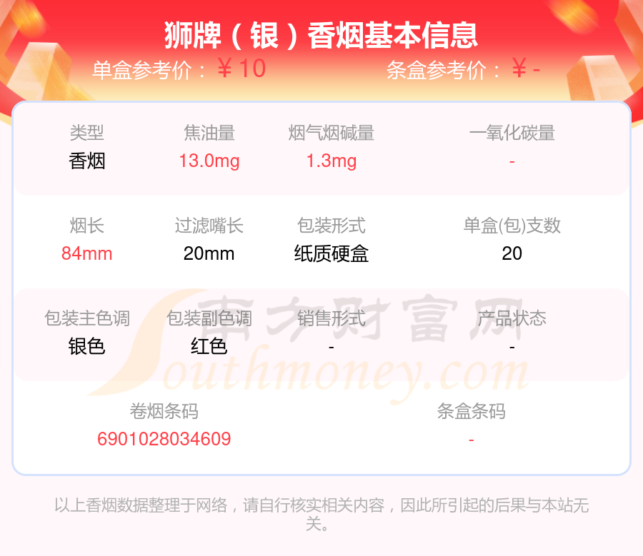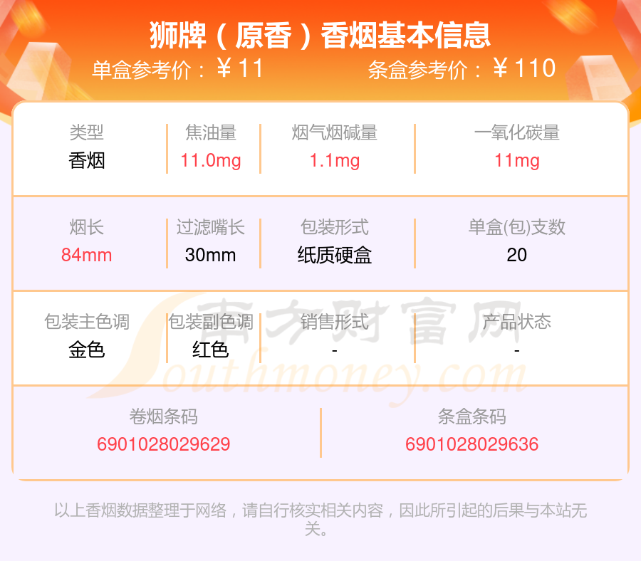 狮牌(微型出口)参考价10.0元/包、狮牌(微型黑)参考价10.0元/包、狮牌(银)参考价10.0元/包、狮牌(锦绣成都)参考价11元/包、狮牌(原香)参考价11.0元/包、狮牌(雄风)参考价14.0元/包、狮牌(阆苑传奇)参考价12.0元/包、狮牌(特香)参考价5.5元/包、狮牌(微型)参考价10.0元/包、狮牌(加勒比阳光)参考价100元/包等。