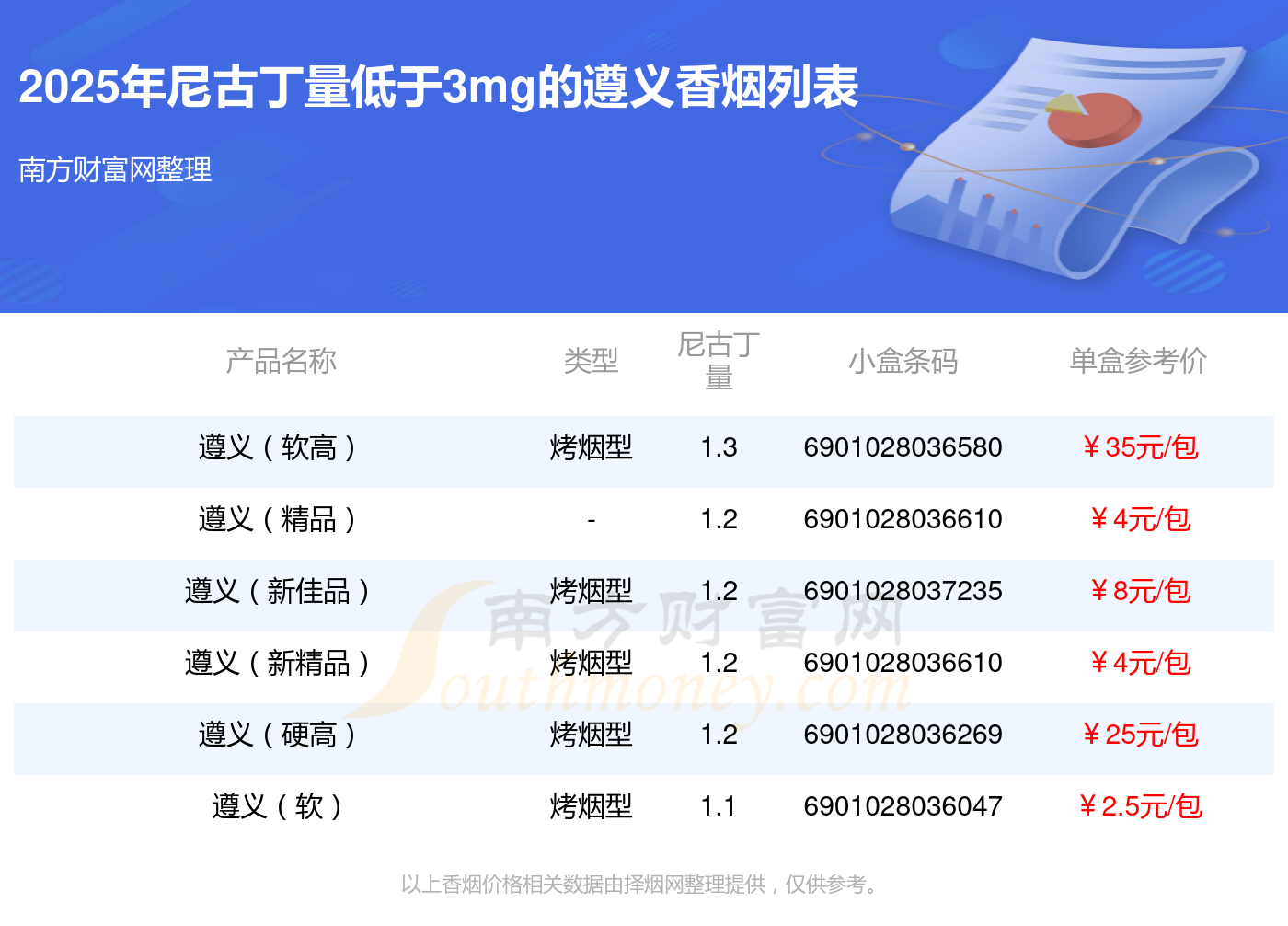 尼古丁量低于3mg的遵义香烟有哪些?择烟网为大家整理盘点,分别有:遵义(软高)、遵义(精品)、遵义(新佳品)、遵义(新精品)、遵义(硬高)、遵义(软)等,具体价格如下: