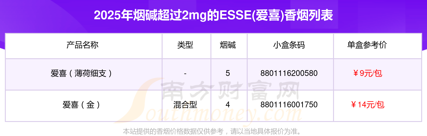 烟碱超过2mg的ESSE(爱喜)香烟有哪些?择烟网为大家整理盘点,分别有:爱喜(薄荷细支)、爱喜(金)等,具体价格如下: