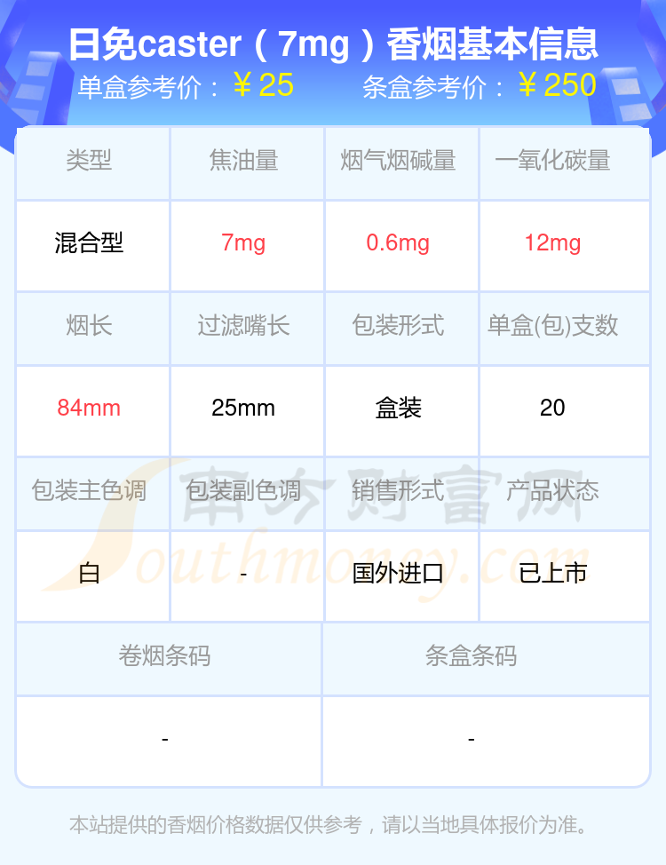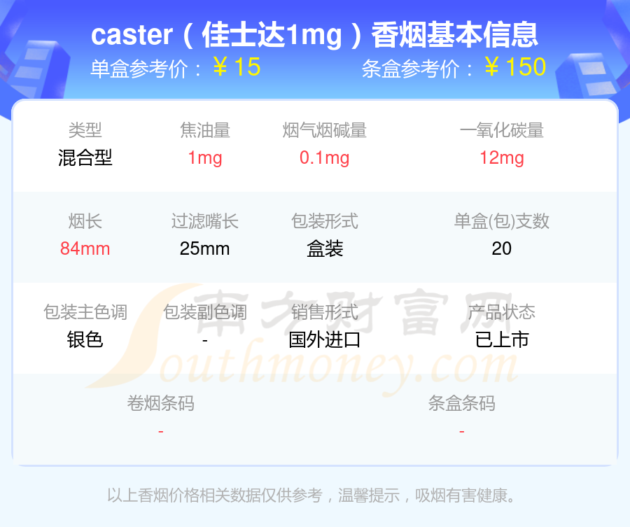 择烟网为大家盘点了烟碱量低于5mg的CASTER(佳士达)香烟,分别有佳士达(原味)、日免caster(7mg)、佳士达(红)、佳士达(红中免)、佳士达(硬红)、佳士达(黄)、caster(佳士达1mg)等,具体价格如下: