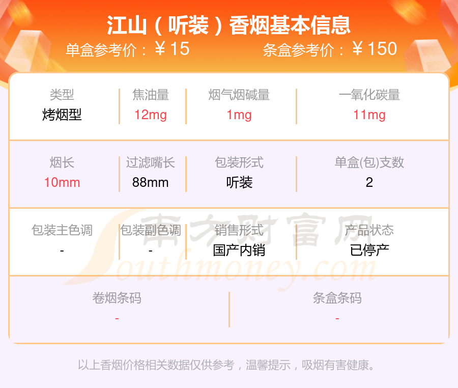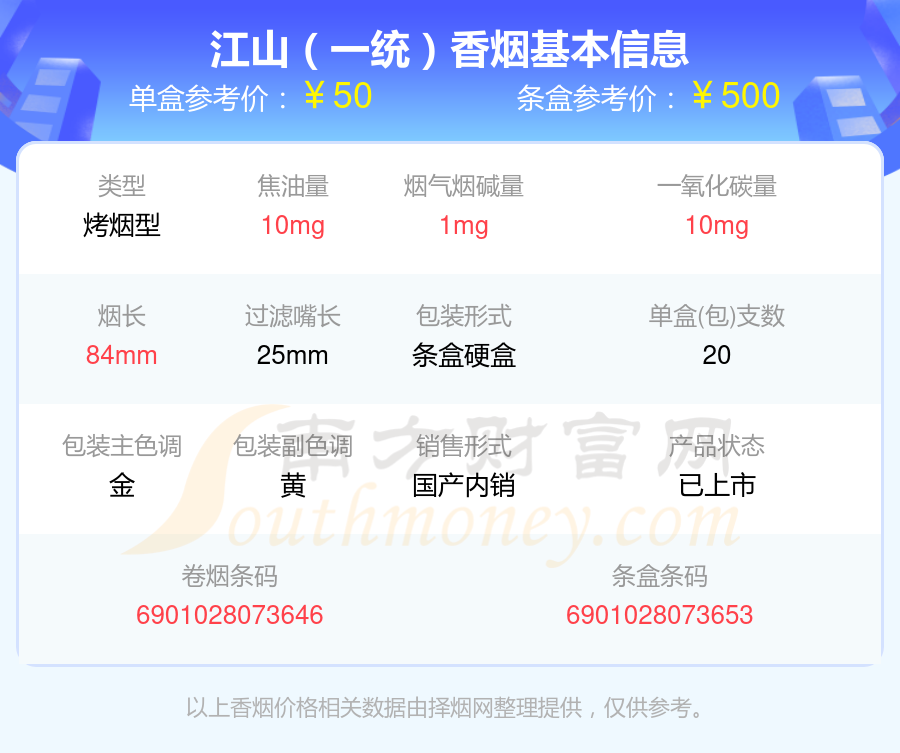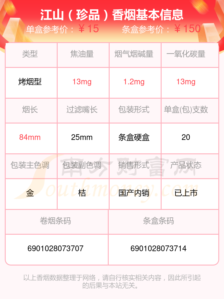 尼古丁量低于4mg的江山香烟有哪些?择烟网为大家整理盘点,有江山(珍品)、江山(精品)、江山(听装)、江山(一统)、天子(千里江山中支)等,详细价格如下: