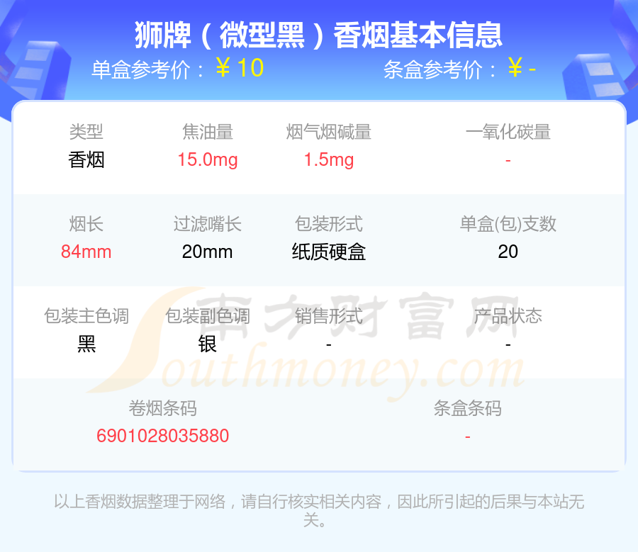 狮牌(微型出口)参考价10.0元/包、狮牌(微型黑)参考价10.0元/包等。