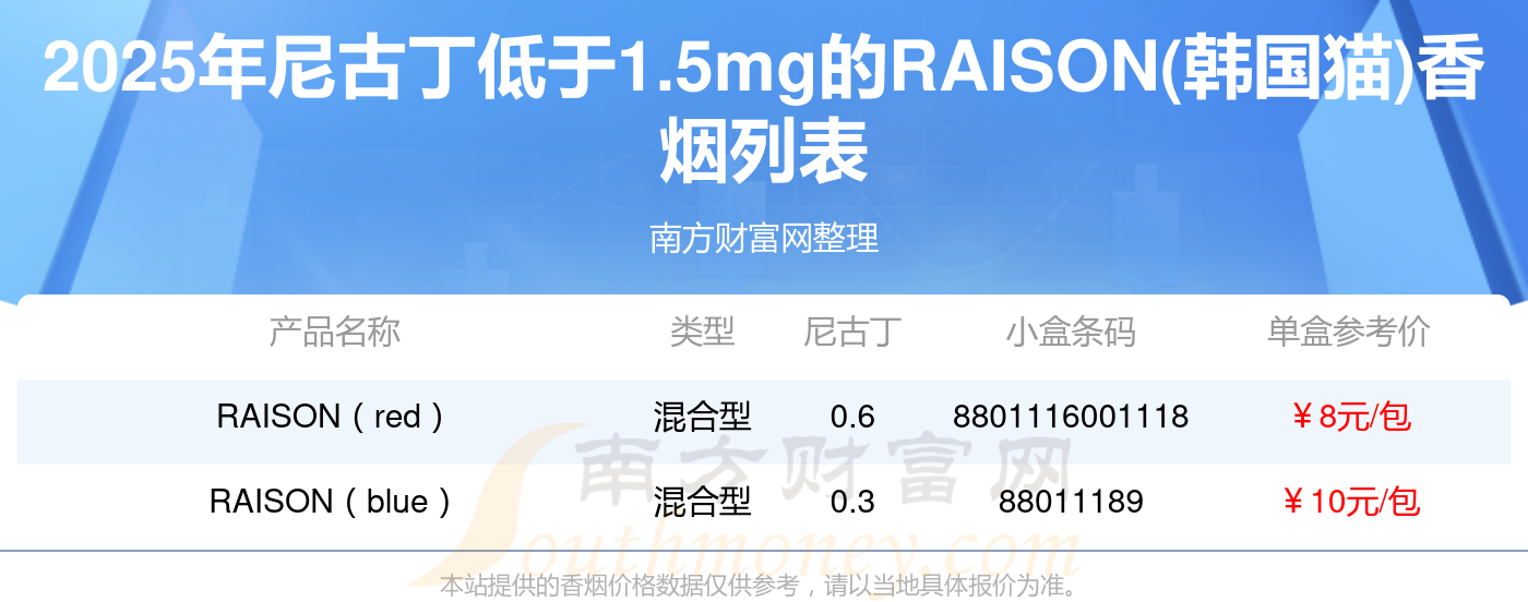 择烟网为大家盘点了RAISON(韩国猫)香烟尼古丁低于1.5mg的,分别有RAISON(red)、RAISON(blue)等,具体价格如下: