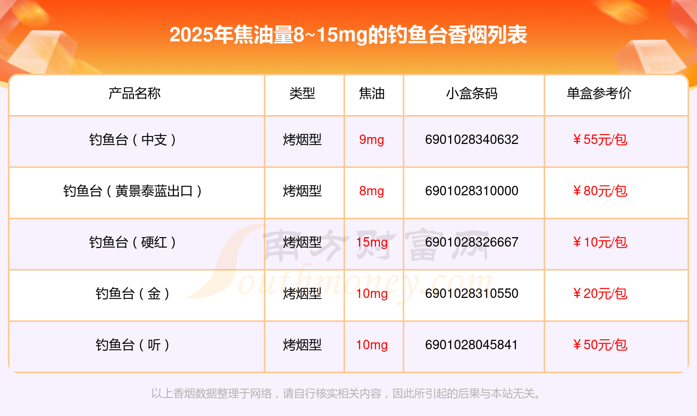 焦油量8~15mg的钓鱼台香烟有哪些?择烟网为大家整理盘点,分别有: