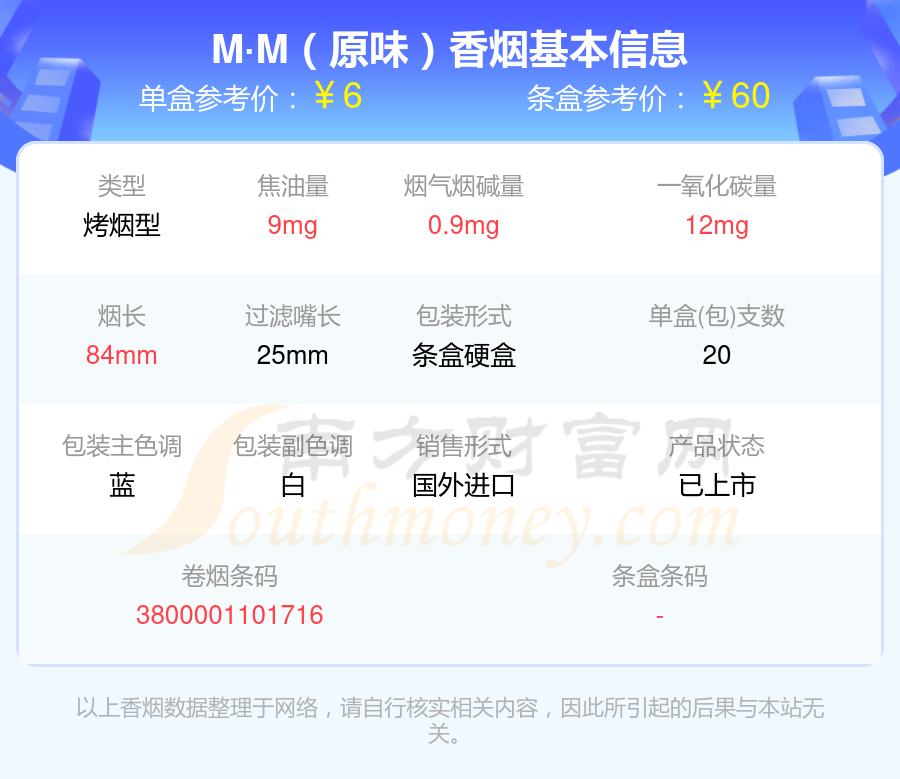 M·M香烟尼古丁量1.5mg以下的烟分别有M·M(原味)参考价6元/包、M·M(大亨6号纤细薄荷)参考价8元/包等。