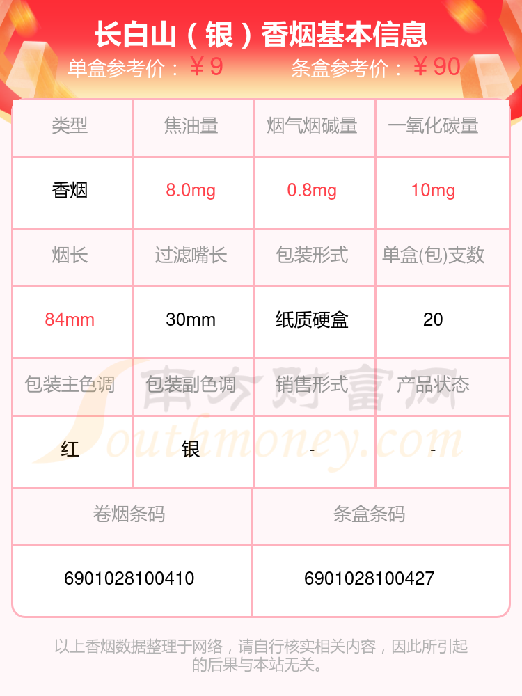 长白山香烟焦油量低于10mg的烟分别有长白山(丹韵)参考价13.0元/包、长白山(迎春中支)参考价11.0元/包、长白山(韵藏天下)参考价33元/包、长白山(蕴藏天下)参考价33元/包、长白山(圣境)参考价20元/包、长白山(鸿运)参考价16.0元/包、长白山(揽胜)参考价22.0元/包、长白山(红)参考价9.0元/包、长白山(软红)参考价11.0元/包、长白山(银)参考价9.0元/包等。
