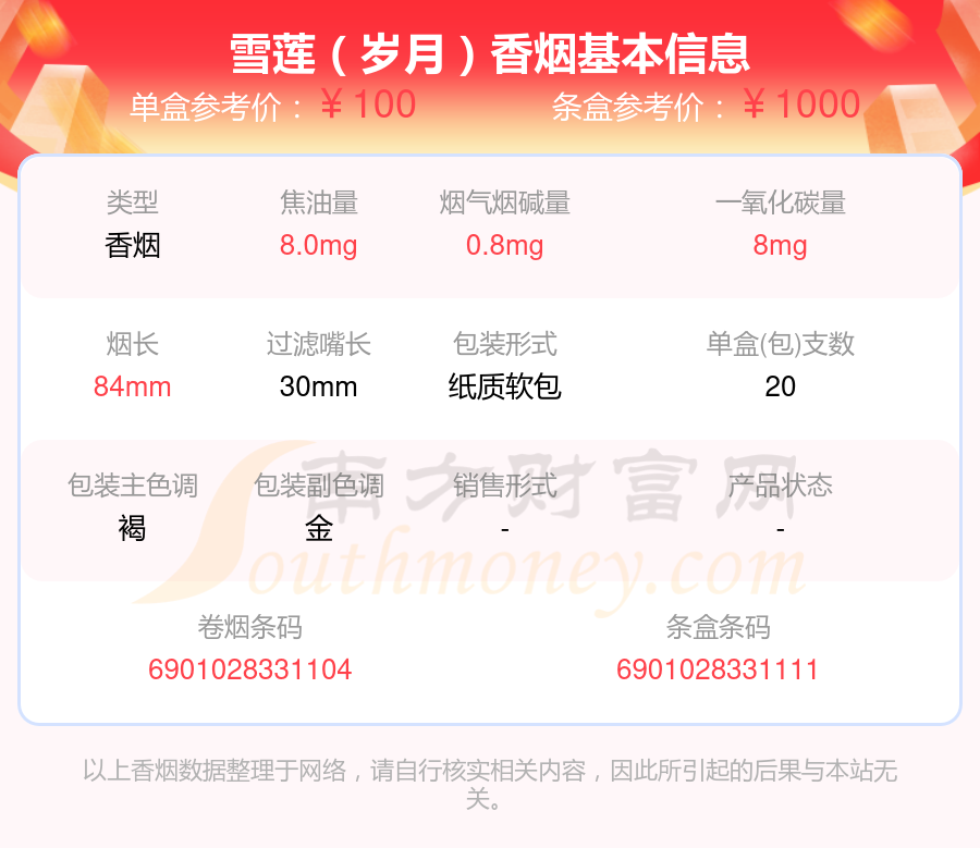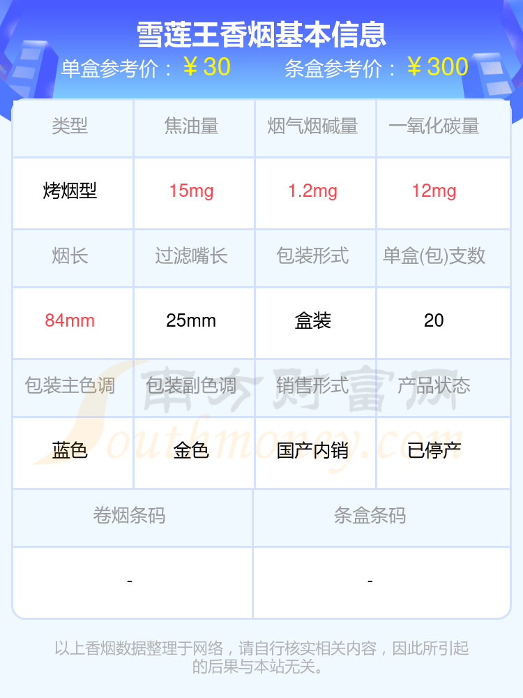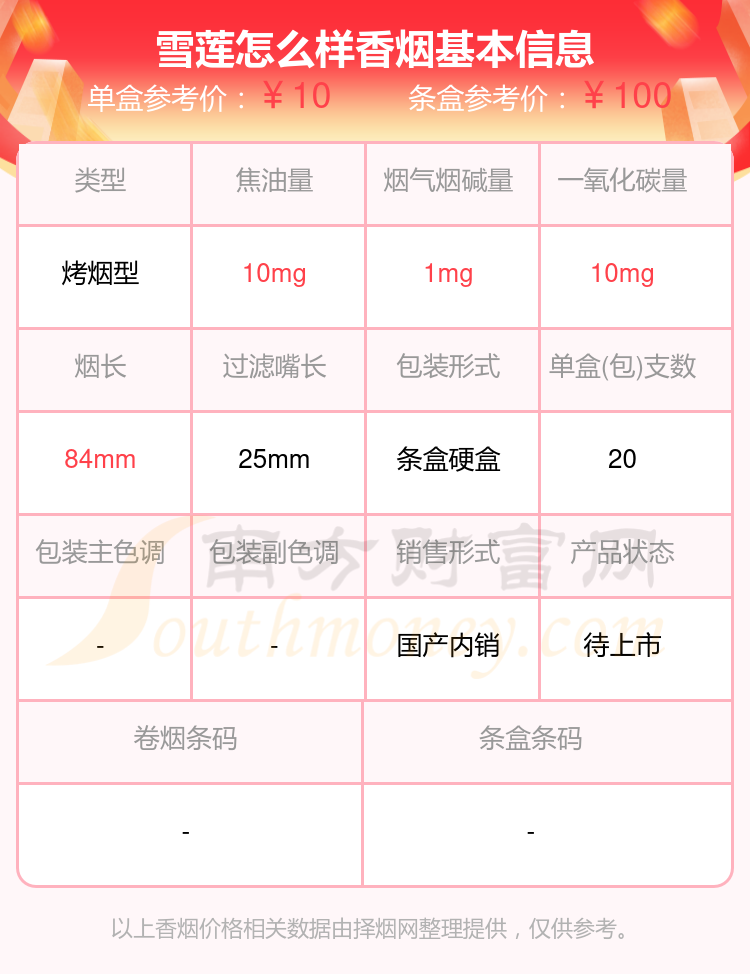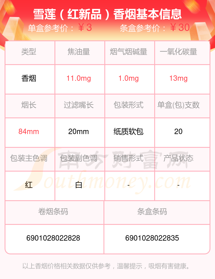 雪莲香烟尼古丁量4mg以下的烟有哪些?择烟网为大家整理提供,分别有:雪莲王、雪莲(红精品)、雪莲(尚禧)、雪莲(红新品)、雪莲(蓝精品)、雪莲(天韵)、雪莲(软蓝)、雪莲怎么样、雪莲(3000)、雪莲(岁月)等,具体价格如下: