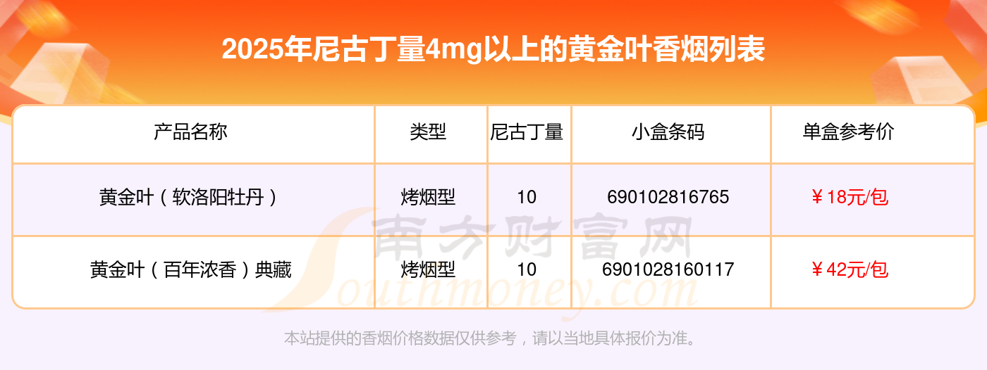 择烟网为大家盘点了黄金叶香烟尼古丁量4mg以上的,分别有黄金叶(软洛阳牡丹)、黄金叶(百年浓香)典藏等,具体价格如下: