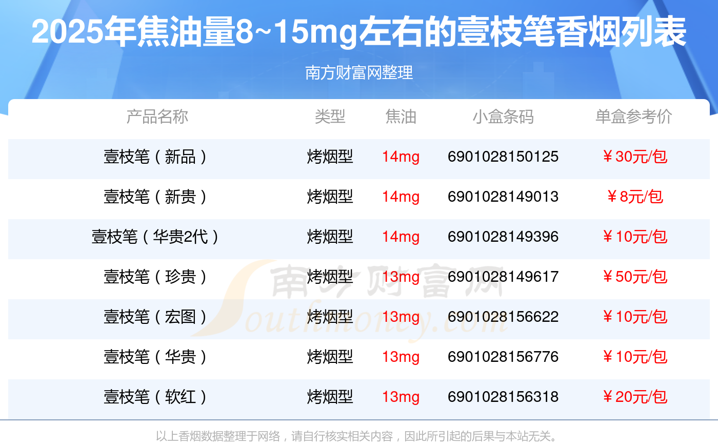 择烟网为大家盘点了焦油量8~15mg左右的壹枝笔香烟,有以下这些: