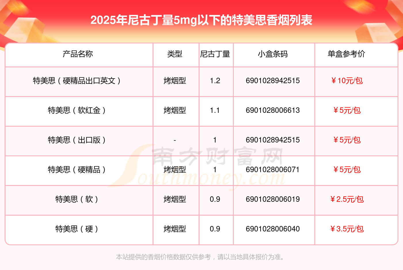 特美思香烟尼古丁量5mg以下的烟有哪些?择烟网为大家整理提供,分别有:特美思(硬精品出口英文)、特美思(软红金)、特美思(出口版)、特美思(硬精品)、特美思(软)、特美思(硬)等,具体价格如下: