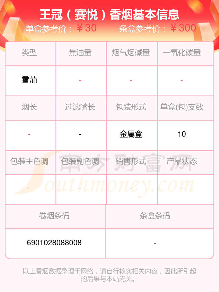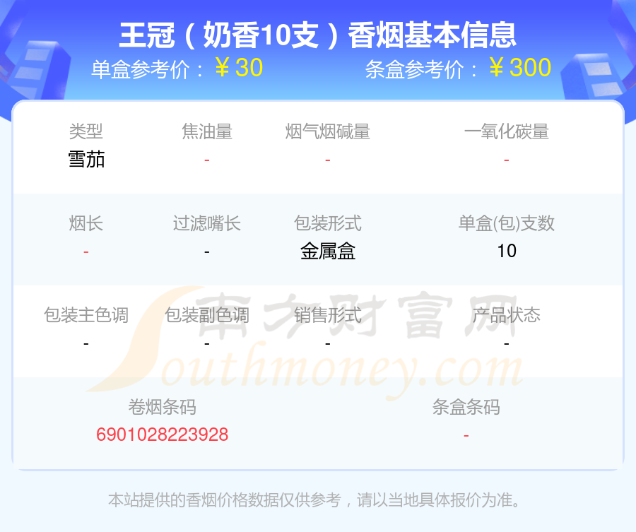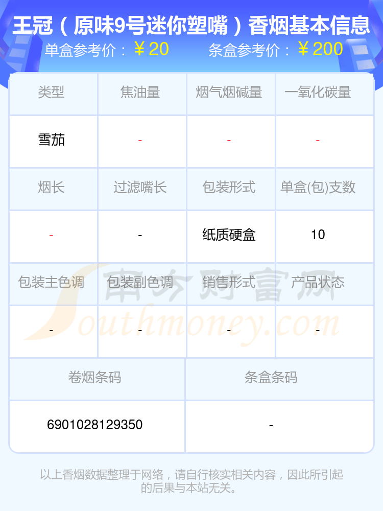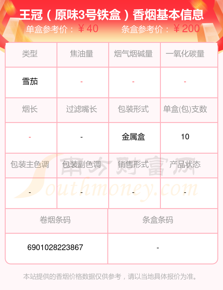 王冠香烟20-40元左右的烟有哪些?择烟网为大家整理提供,分别有:王冠(原味3号铁盒)、王冠(香草MIX)、王冠(原味2号)、王冠(奶香10支)、王冠(大连印象)、王冠(城市印象)、王冠(赛悦)、王冠(国粹荣耀)、王冠(万象细支)、王冠(原味9号迷你塑嘴)等,具体价格如下: