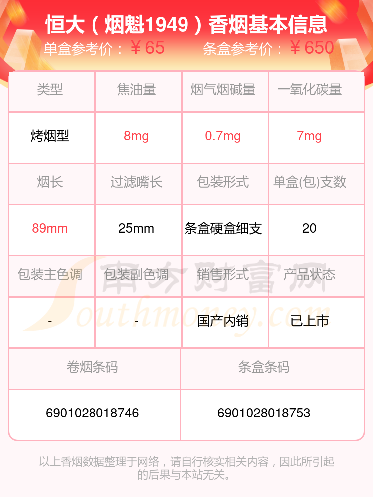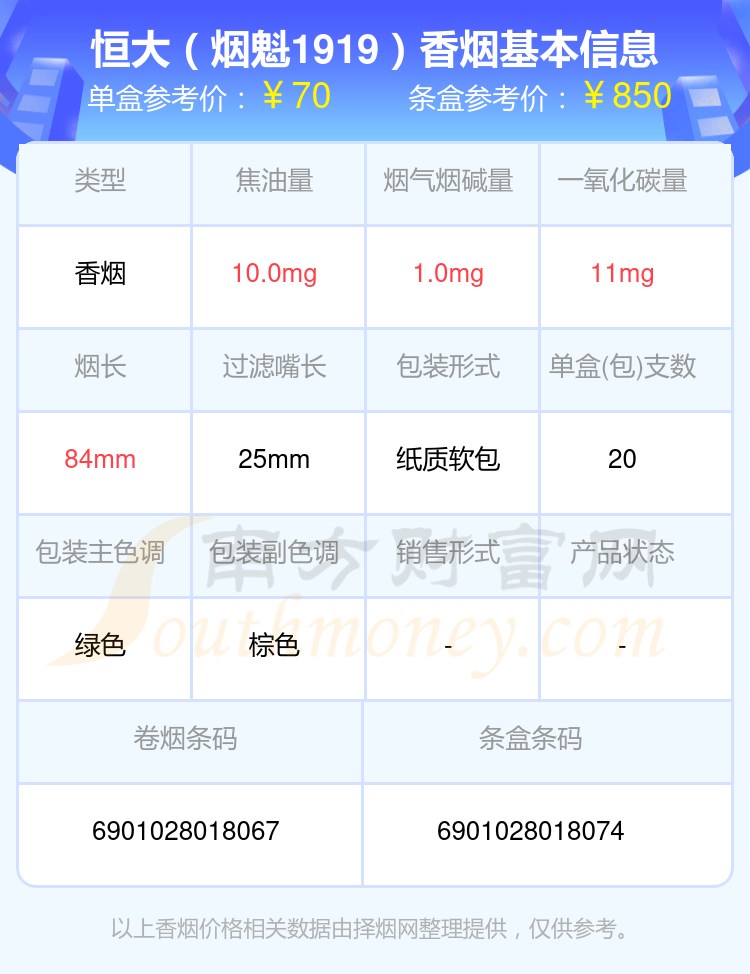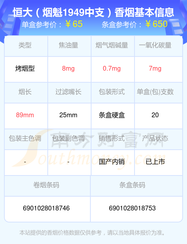 恒大(烟魁1919)参考价70.0元/包、恒大(烟魁1949)参考价65元/包、恒大(烟魁1949中支)参考价65元/包等。