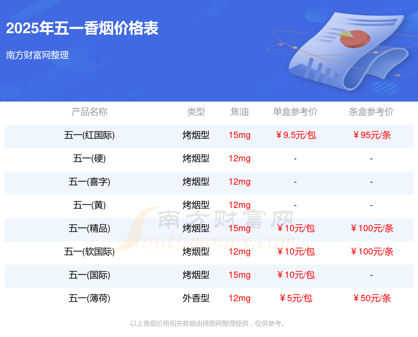 五一(精品)参考价10.0元/包、五一(软国际)参考价10.0元/包、五一(国际)参考价10.0元/包、五一(红国际)参考价9.5元/包、五一(薄荷)参考价5.0元/包。