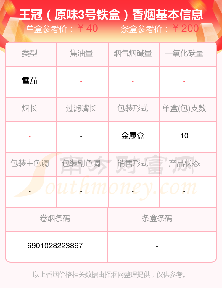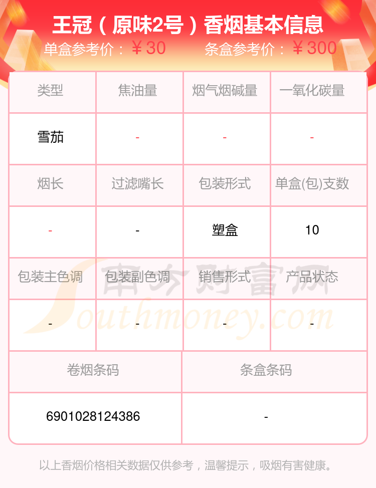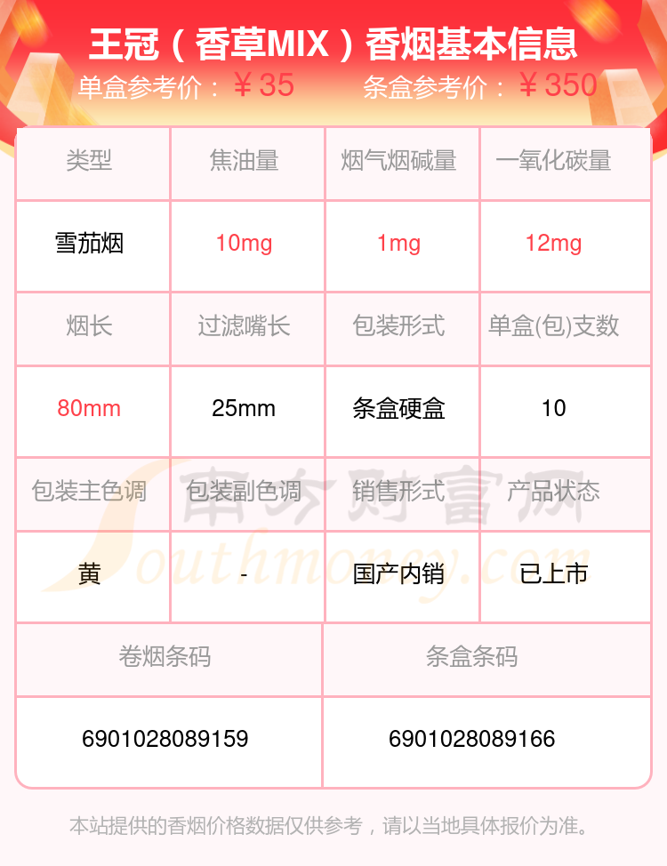 择烟网为大家盘点了三十元到六十元的王冠香烟,分别有王冠(铝2支全叶卷)参考价60.0元/包、王冠(古型)参考价50.0元/包、王冠(原味1号)参考价50.0元/包、王冠(国粹名角)参考价50元/包、王冠(原味3号铁盒)参考价40.0元/包、王冠(香草MIX)参考价35元/包、王冠(原味2号)参考价30.0元/包、王冠(奶香10支)参考价30.0元/包、王冠(大连印象)参考价30.0元/包、王冠(城市印象)参考价30.0元/包等。