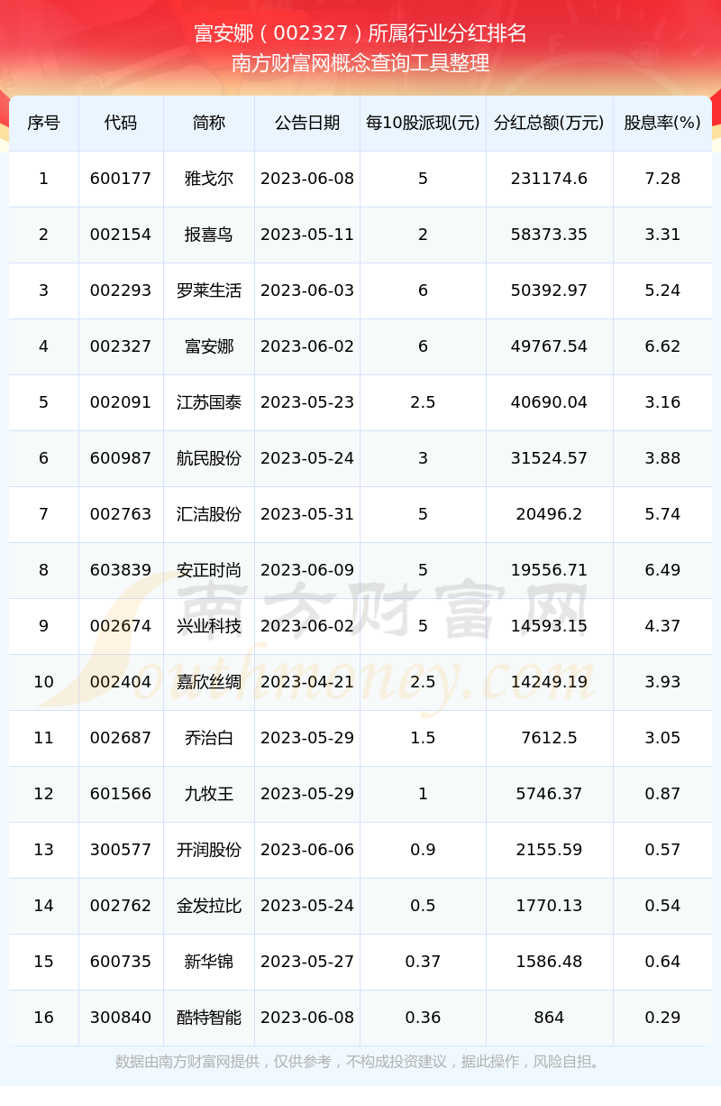 二、富安娜002327行业分红排名