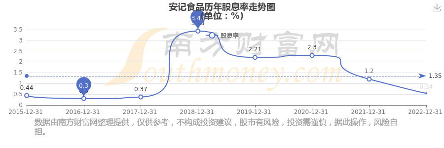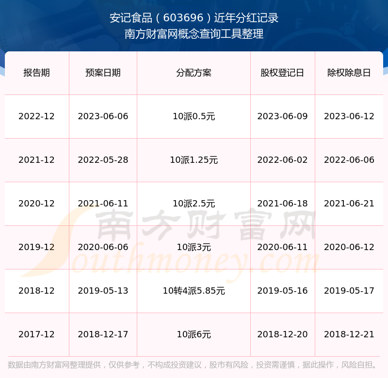 安记食品最新一次公布的分红方案为10派0.5元。本次权益分派股权登记日为2023年6月9日,除权除息日为2023年6月12日,派息日为2023年6月12日。