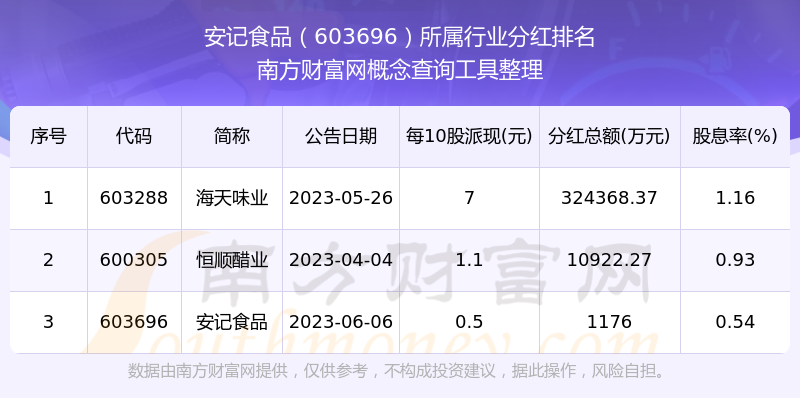 按照开云手机web版登录入口趋势选股系统统计,安记食品所属行业为调味品行业,调味品行业分红排名情况如下表: