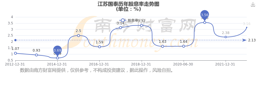 近年江苏国泰年度股息率走势如下图: