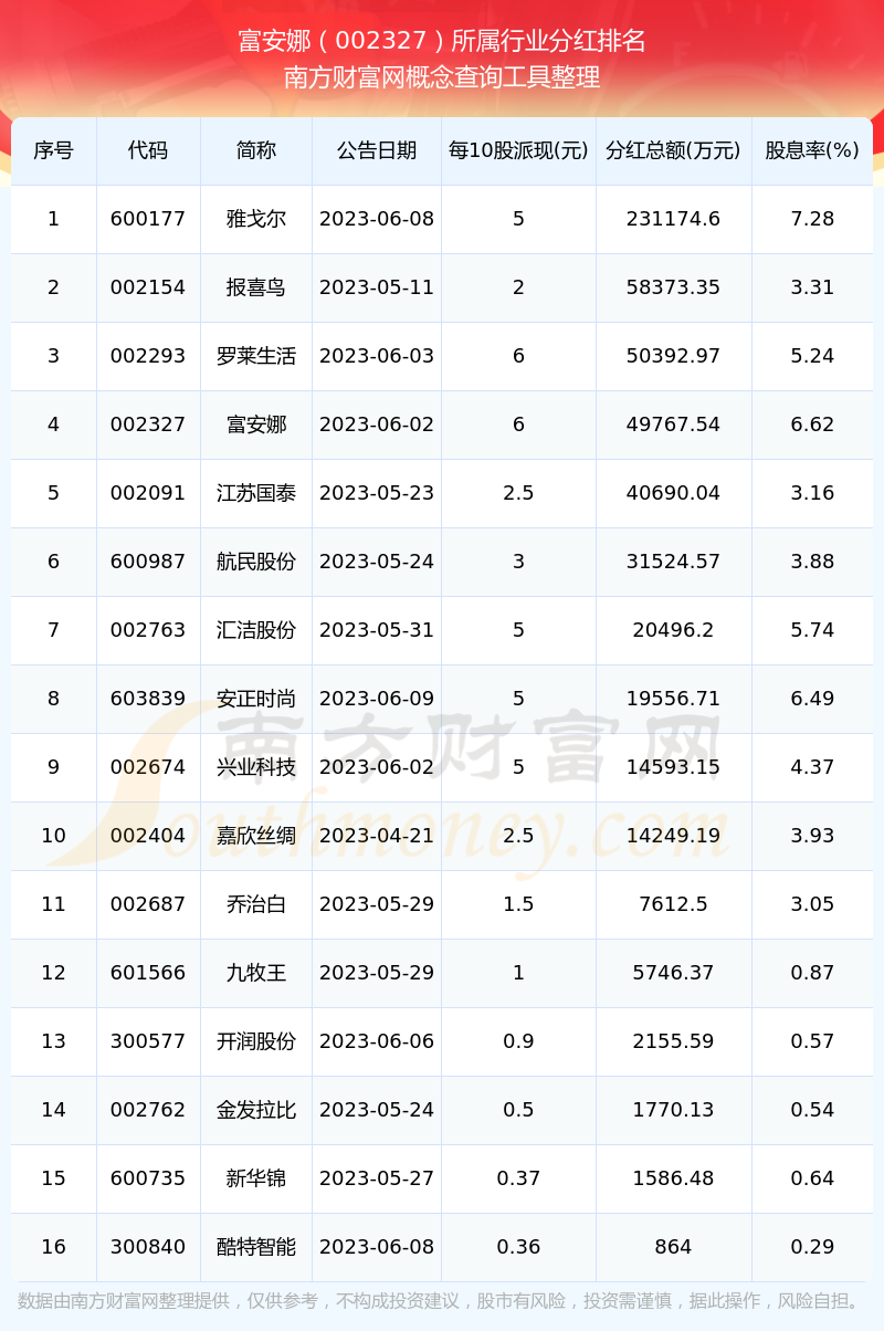 按照开云手机web版登录入口趋势选股系统统计,富安娜所属行业为纺织服装行业,纺织服装行业分红排名情况如下表: