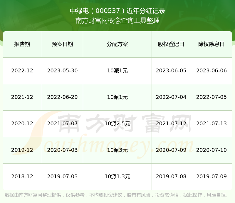 中绿电最新一次公布的分红方案为10派1元。本次权益分派股权登记日为2023年6月5日,除权除息日为2023年6月6日,派息日为2023年6月6日。