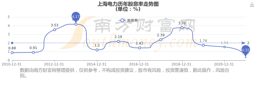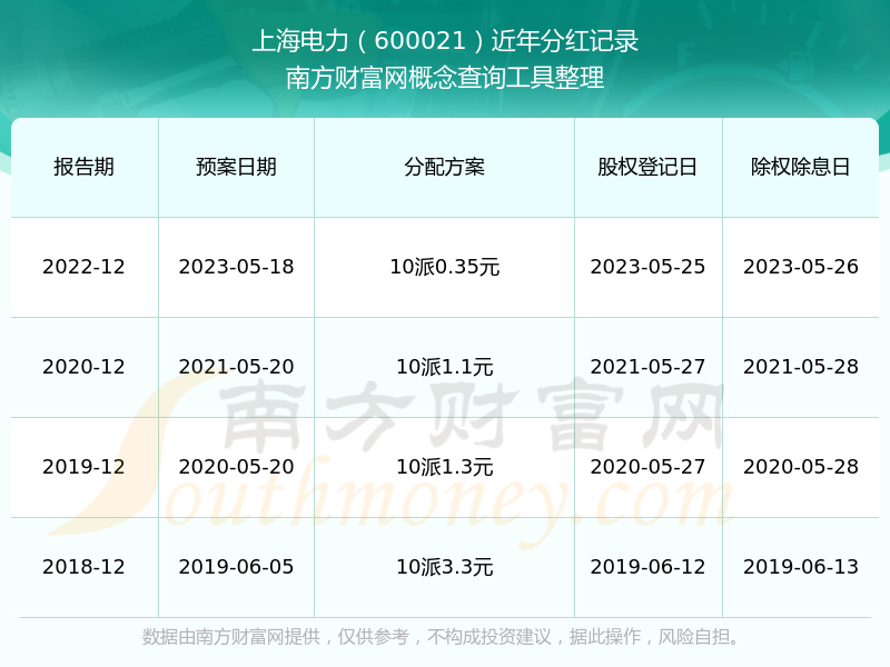 上海电力最新一次公布的分红方案为10派0.35元。本次权益分派股权登记日为2023年5月25日,除权除息日为2023年5月26日,派息日为2023年5月26日。