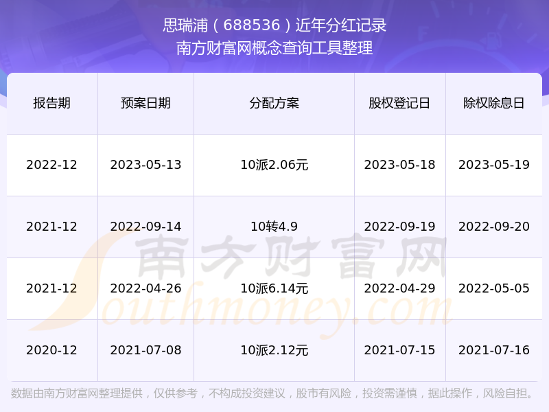 思瑞浦最新一次公布的分红方案为10派2.06元。本次权益分派股权登记日为2023年5月18日,除权除息日为2023年5月19日,派息日为2023年5月19日。