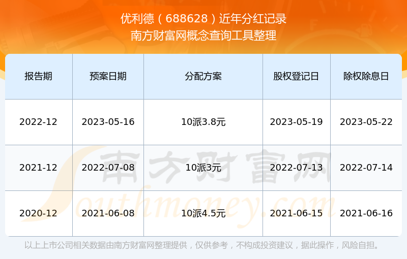 优利德最新一次公布的分红方案为10派3.8元。本次权益分派股权登记日为2023年5月19日,除权除息日为2023年5月22日,派息日为2023年5月22日。