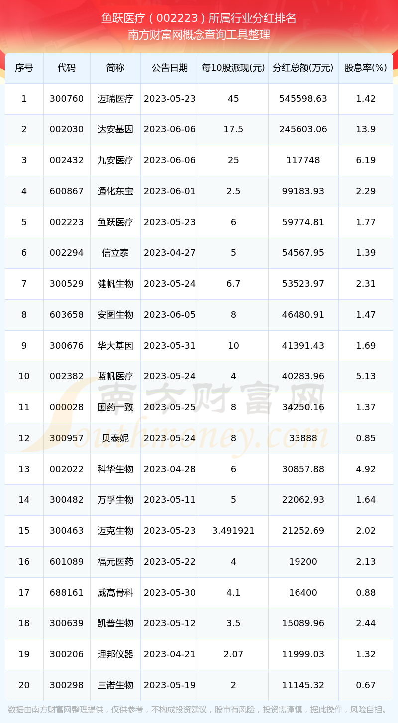 二、鱼跃医疗002223行业分红排名