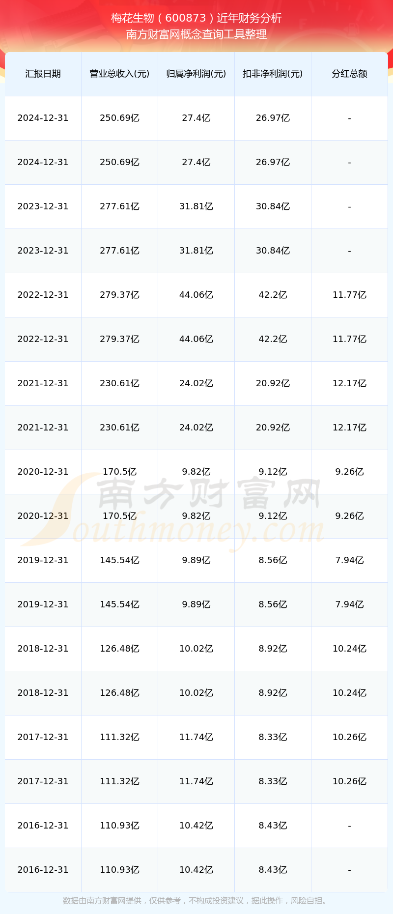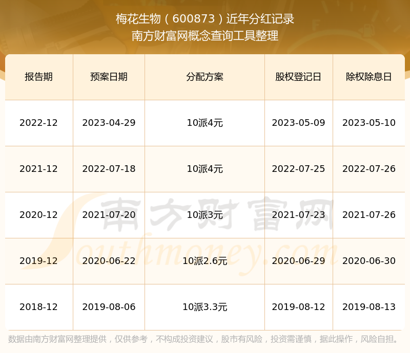 近年梅花生物分红派息情况如下表所示: