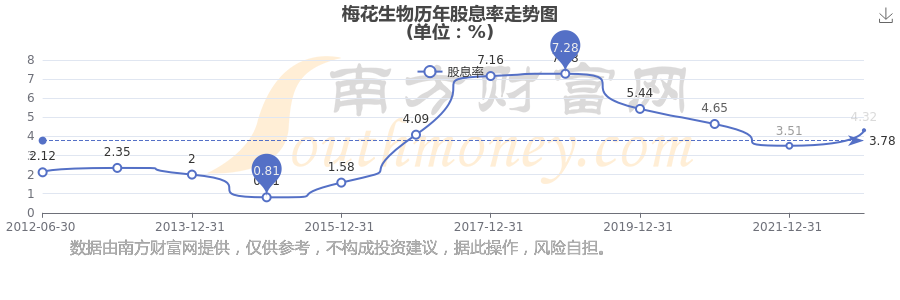 梅花生物历年股息率走势如下图: