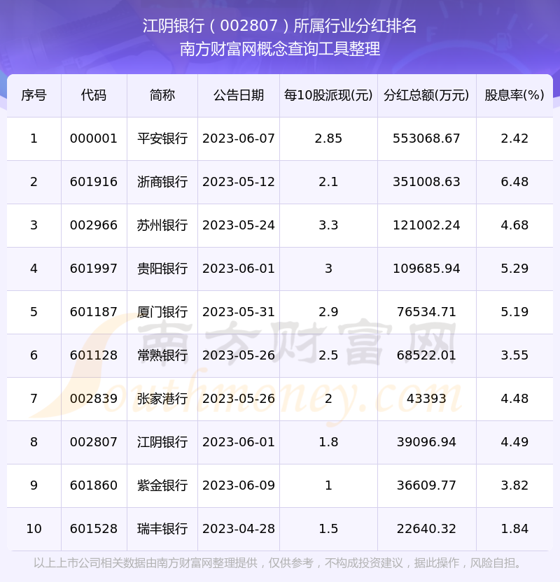 二、江阴银行002807行业分红排名