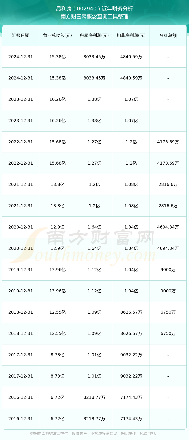 2024年昂利康总营收15.38亿,同比增长-5.41%;净利润8033.45万,同比增长-41.94%;销售毛利率40.13%。