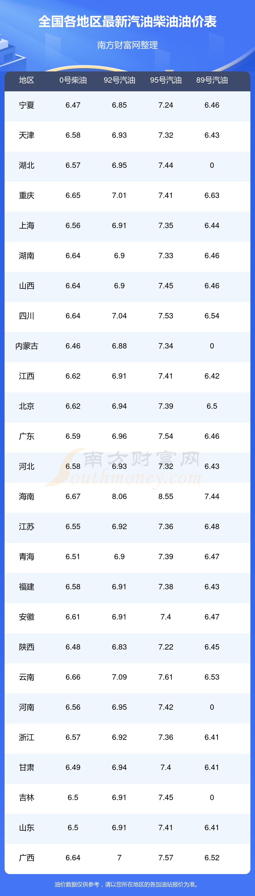 附:最新全国汽油、柴油价格一览表