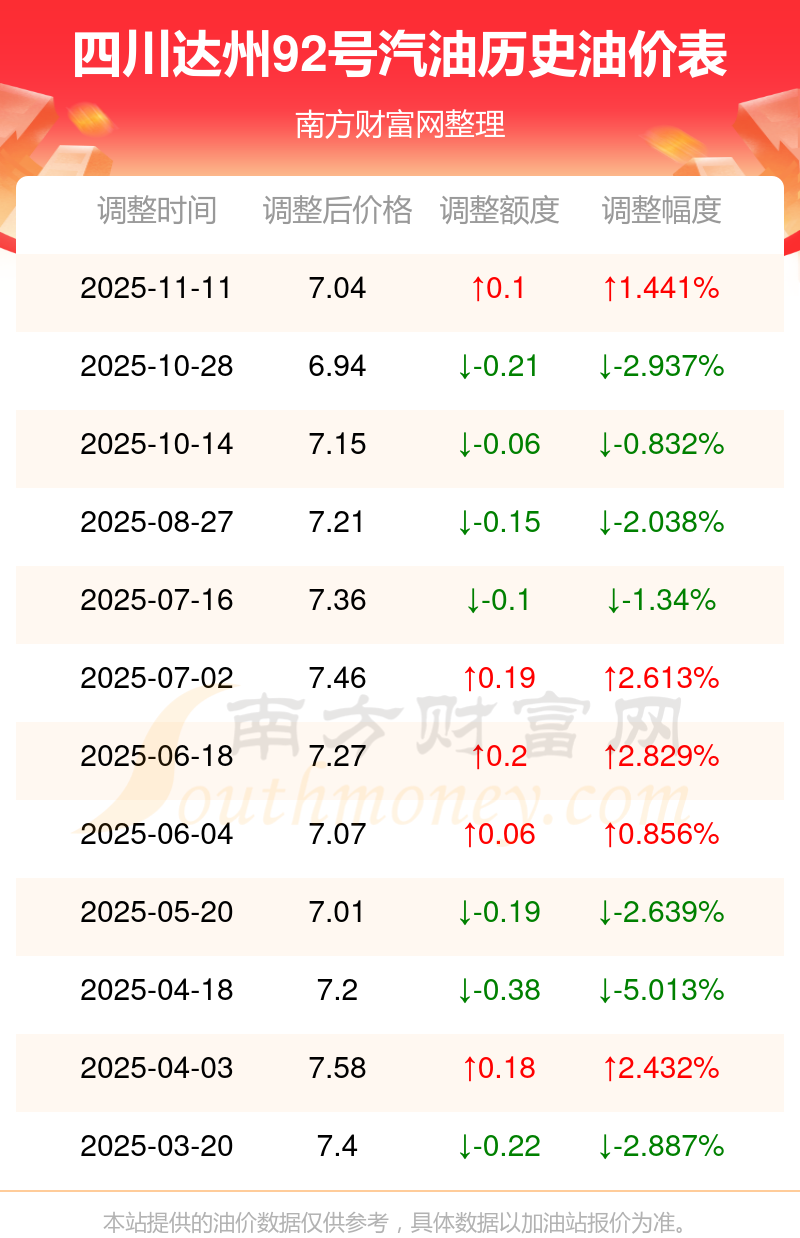 四川达州92号汽油11月19日最新价格为7.04元/升,调整时间为11月11日,相对上次调整升了0.1元,升1.441%。下一轮油价调整时间11月24日24时,距离现在还有5.39天。
