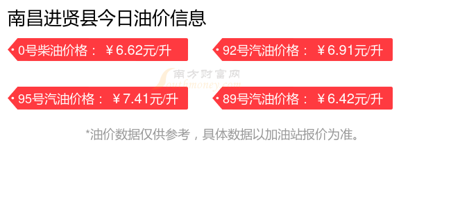 南昌进贤县汽油、柴油11月19日每升最新价格为:95号汽油为7.41元,涨了0.1元;92号汽油为6.91元,涨了0.1元;89号汽油为6.42元,涨了0.09元;0号柴油为6.62元,涨了0.1元,调整时间为11月11日。