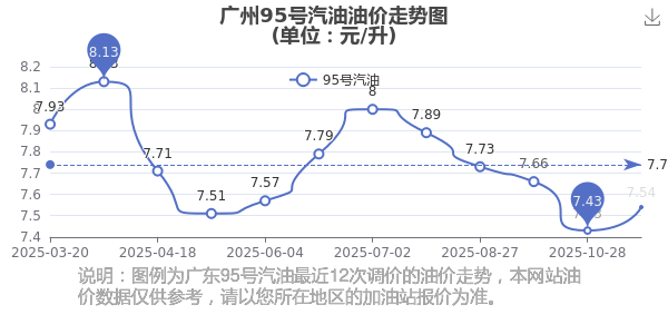 油价调整最新消息:11月19日广州汽油、柴油价格是11月11日调整后的价格,每升价格具体为:92号汽油为6.96元,升了0.1元,升幅达1.46%;95号汽油为7.54元,升了0.11元,升幅达1.48%;89号汽油为6.46元,升了0.09元,升幅达1.41%;0号柴油为6.59元,升了0.1元,升幅达1.54%。广州下一轮油价调整时间11月24日24时,距离现在还有5.39天。