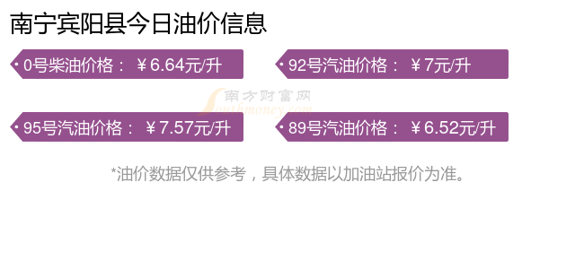 南宁宾阳县汽油、柴油11月19日每升最新价格为:0号柴油为6.64元,上升了0.1元;95号汽油为7.57元;92号汽油为7元;89号汽油为6.52元,调整时间为11月11日。