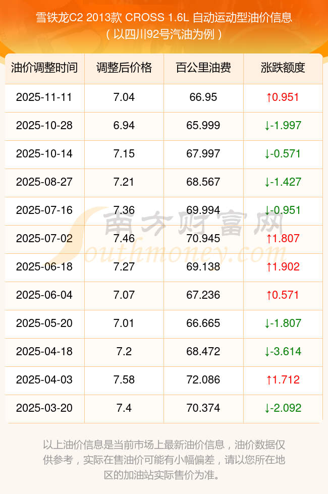 按照11月11日92号汽油最新调整价格7.04元/升来计算(以四川为例),该车型百公里平均油费为66.95元,按照上一轮10月28日调整价格6.94元/升来计算,百公里平均油费为65.999元,对比上一轮多花0.951元,下一轮油价调整时间为11月24日24时。