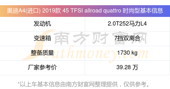 奥迪A4(进口) 2019款 45 TFSI allroad quattro 时尚型动力方面,搭载的是一台2.0T252马力L4涡轮增压发动机,匹配7挡双离合自动档变速箱,燃料形式为汽油,常规整备质量1730kg,厂家参考价39.28万元。
