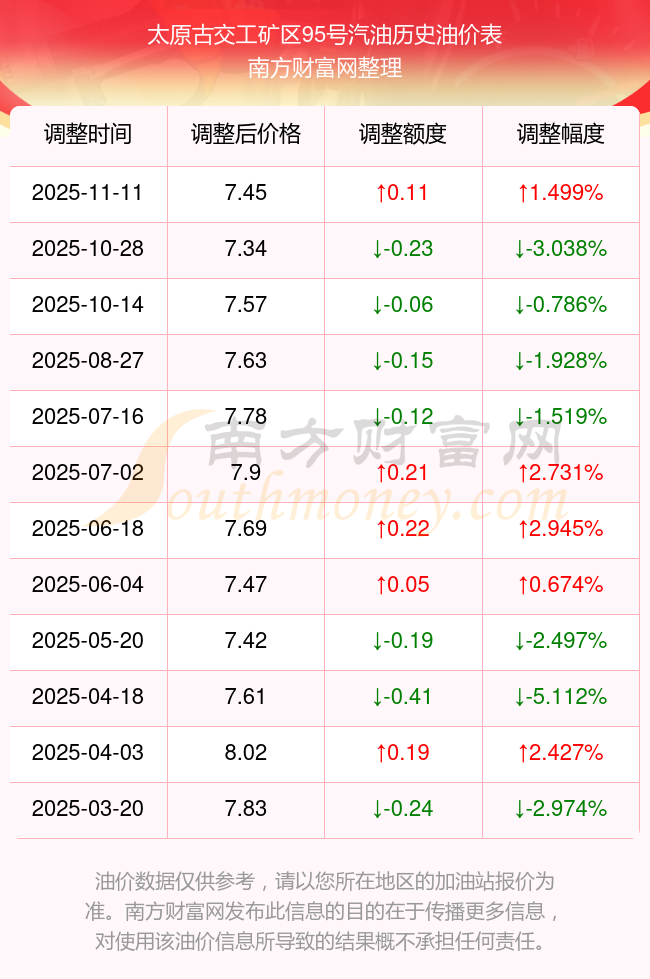 太原古交工矿区95号汽油历史油价表