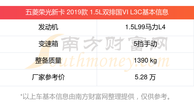 在动力方面,五菱荣光新卡 2019款 1.5L双排国VI L3C搭载的是一台1.5L99马力L4自然吸气发动机,匹配5挡手动挡变速箱,燃料形式为汽油,常规整备质量1390kg,厂家参考价5.28万元。