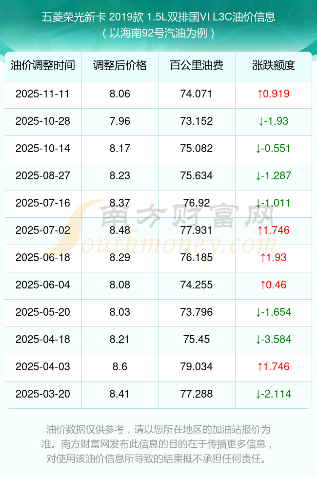 根据11月11日92号汽油最新调整价格8.06元/升来计算(以海南为例),该车型每百公里的平均油费是74.071元,上一轮10月28日调整价格7.96元每升来计算,每百公里的平均油费是73.152元,对比上一轮多花0.919元,下一轮的油价调整时间是11月24日24时。